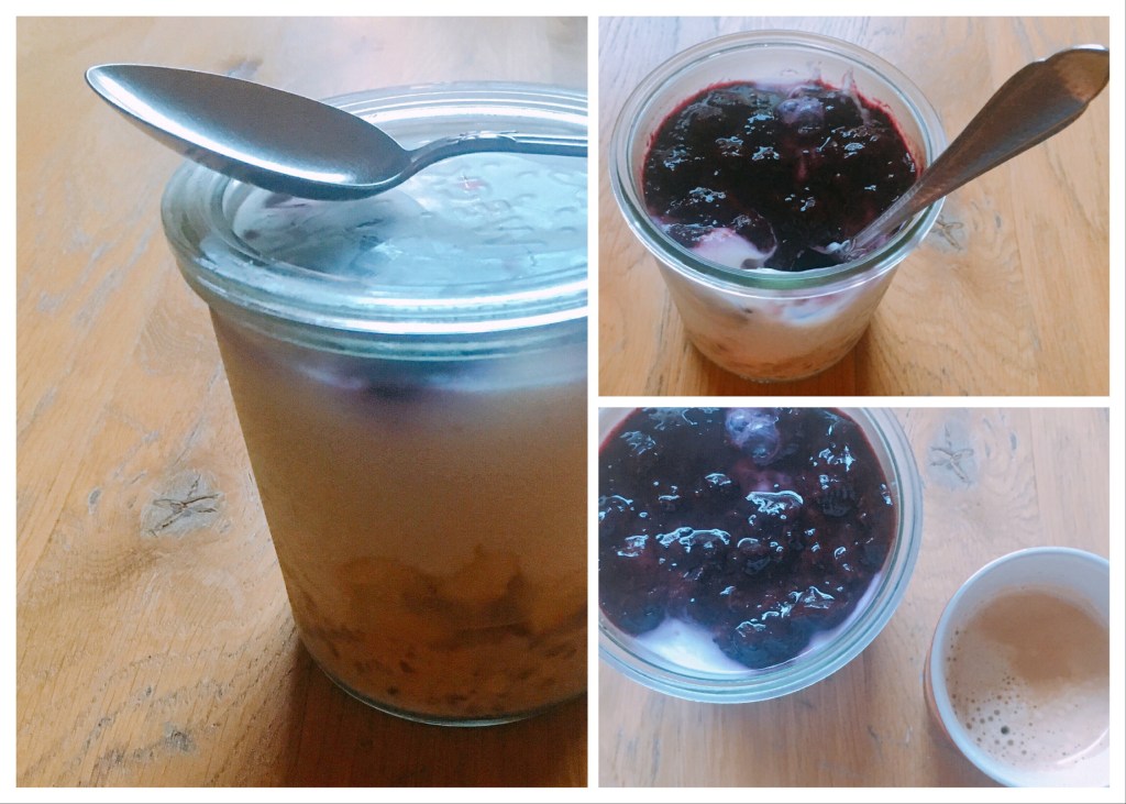 De crumble kun je makkelijk zelf maken, maar eigenlijk gebruik ik nu altijd een granola die ik heb staan. Van de bosbessen topping maak ik 2 porties, doe het in een potje en zo in de koelkast. De avond van te voren hoef ik dan alleen nog de laagjes te maken.