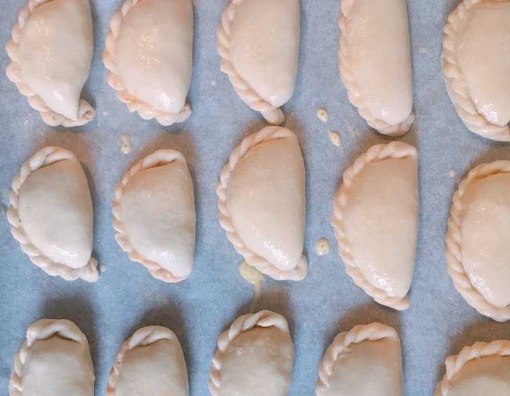 | 5. Neem het deeg uit de koelkast en rol uit. Het deeg moet zo’n 3 millimeter dik zijn. Steek cirkels uit van zo’n 10 centimeter. Klop een ei los. Neem een deegcirkel en vul met een flinke eetlepel vulling. Bestrijk de rand van het deeg met ei en vouw dubbel. Vouw de rand dicht of druk dicht met een vork. Doe dit met al het deeg/vulling. Leg ze op een bakplaat, besmeer met ei en bak de empanadas 30-40 minuten in de oven, totdat ze goudbruin zijn. |
