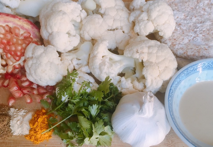 | 7. Doe de bloemkool in een schaal. Strooi er wat koriander en granaatappelpitjes over. Zet op tafel met de sla, komkommer, pitas, knoflooksaus en eventueel sriracha. Serveer met een salade. |