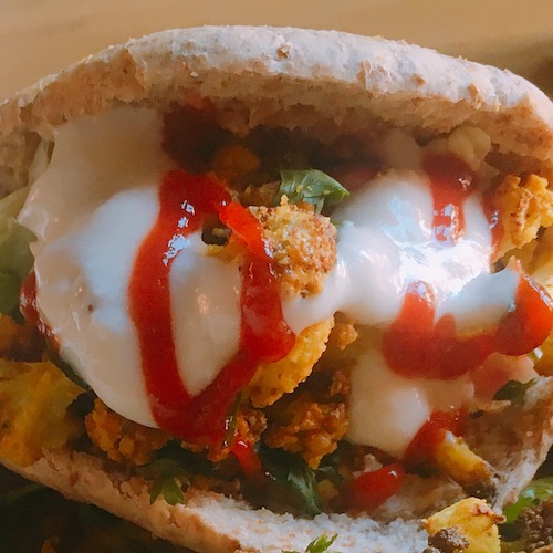 De bloemkool kun je in een airfryer maken, wat nog sneller is. Als je geen airfryer hebt gaat het in de oven ook goed. Aan tafel vul ik de broodjes met bloemkool, sla, komkommer en knoflooksaus. Ik vind iets pittigs wel lekker erbij, dus doe er ook altijd nog wat sriracha op.