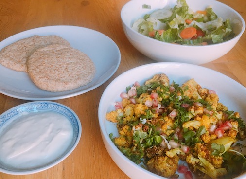 | 3. Bak de bloemkool een half uur in de oven of een kwartier op 180°C in de airfryer. Bak of rooster ook de pitabroodjes. |