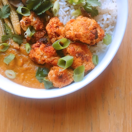 Gister had ik een snack-avondje. Ik had mini loempia’s, tofu nuggets en ‘bang bang bloemkool’ gemaakt. De bang bang bloemkool is een gepaneerde bloemkool, die je na het bakken in saus husselt en vervolgens nog 5 minuutjes bakt. Ik had wat van deze krokante bloemkool over en serveerde het als curry. Deze saus is zo gemaakt en kun je serveren met wat je nog in huis hebt.