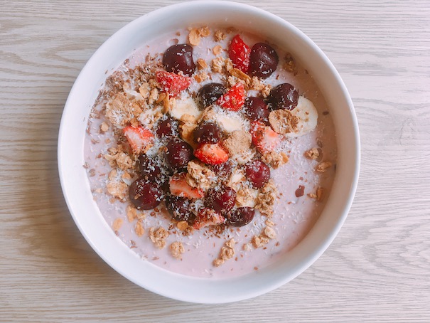 Door deze mousse pureer ik aardbei, kersen en banaan, waardoor je een lekker fruitmousse krijgt. Met een klein beetje limoen erdoor vind ik hem nog net wat frisser. Verdeel er nog wat fruit over, kokos en krokante granola en je hebt een heerlijk ontbijtje.
