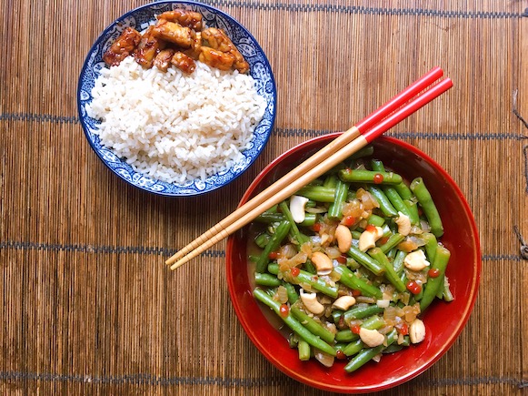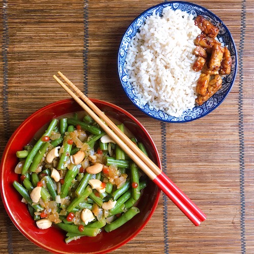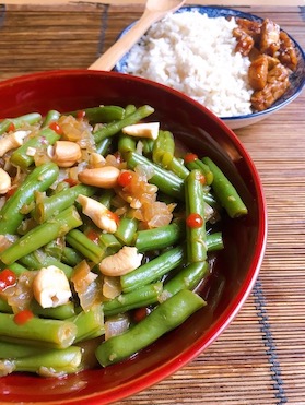 Ik maak in verhouding vrij veel boontjes. Voor sommige mensen is dit misschien genoeg voor vier personen, maar ik eet dan liever wat minder rijst. De saus maak ik licht gebonden, dan vind ik hem het lekkerst. Op het laatste moment strooi ik er nog wat cashewnoten over, die geven een lekkere bite. Gebakken uitjes zouden ook goed kunnen.