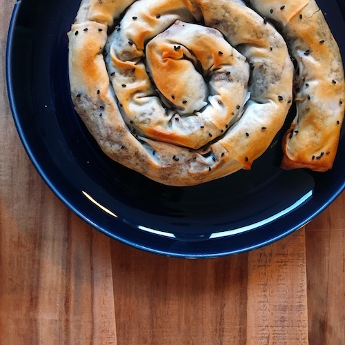 | 7. Bestrijk het filodeeg met wat olie en bestrooi eventueel met wat sesamzaadjes. Bak op de bakplaat in de oven goudbruin op 200°C. Dit duurt een half uur tot driekwartier. |