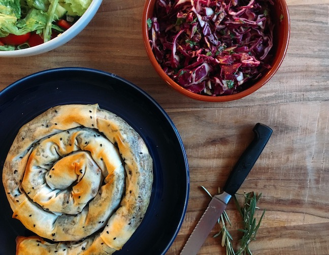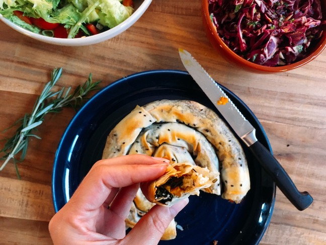 Doordat de pompoen een half uur in de oven moet en daarna de filorol nog een half uur tot driekwartier, duurt het wel even voor het klaar is. Ik maak daarom de pompoen, spinazie en amandelricotta in het weekend. Doordeweeks hoef ik dan alleen nog de vulling over het filodeeg te verdelen, het deeg op te rollen en vervolgens af te bakken. Ik serveer hem met een salade.