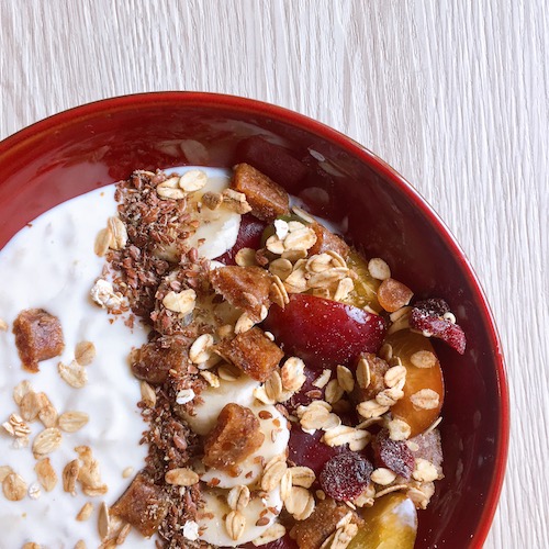 | 3. Vijzel de lijnzaad en snijd de pruimen in partjes. Verdeel over de yoghurt. Snijd de rest van de banaan in plakjes en verdeel ook over de yoghurt. |