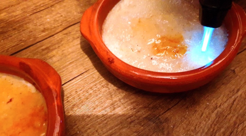 | 7. Als de crema opgesteven is maak je de karamellaag erop. Verdeel 1 eetlepel suiker over een schaaltje (of maak hoopjes) en laat smelten met een brander. Herhaal met de rest. |
