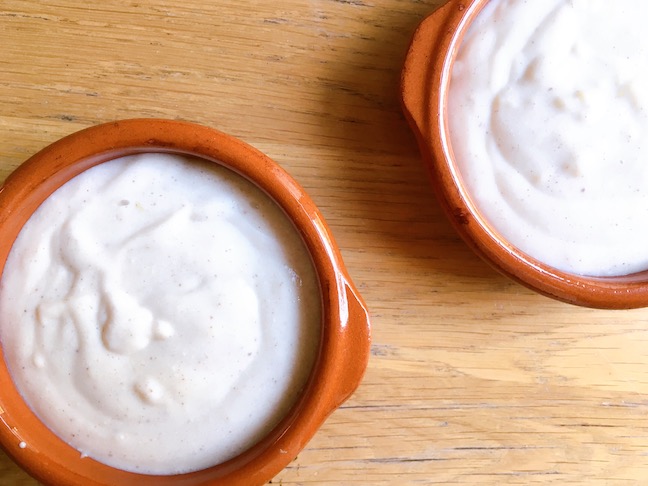 De crema maak ik van sojamelk en silken tofu. Silken tofu vind ik nog iets romiger dan alleen sojamelk en zorgt ervoor dat de crema wat stijver wordt. Voor de gele kleur zou je er nog een heel klein beetje kurkuma door kunnen doen. Door de crema doe ik een klein beetje zoetstof en geen suiker. Suiker gaat er nog meer dan voldoende op. Ik maak de crema dus ook niet te zoet. Anders wordt het geheel veel te zoet met de suikerlaag die er nog op komt.