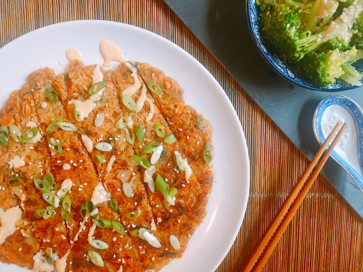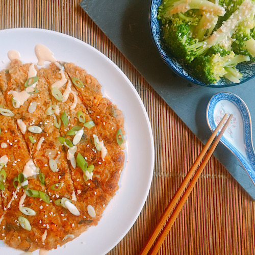 Weer een recept met kimchi. Nu ik twee potten heb staan, wil ik wel wat verschillende recepten maken. Tot nu toe heb ik het met rijst gegeten, dus deze pannenkoeken zijn weer eens wat anders. En super lekker. Ze zijn smeuïg, wat lekker is bij de pittige, licht zurige smaak van de kimchi. Met een broccolisalade ernaast heb je een lekker avondmaaltijd.
