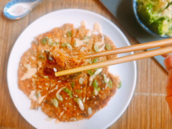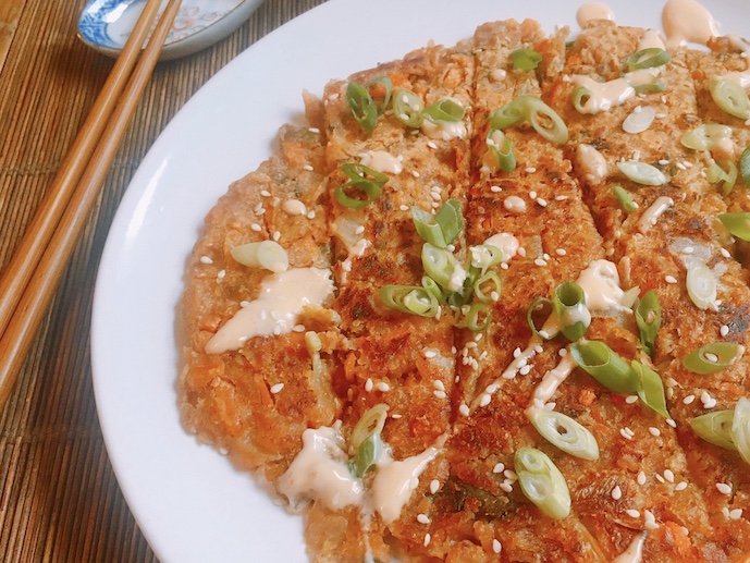 Normaal gesproken worden de pannenkoeken met een dipsausje van sojasaus geserveerd. Ik heb er nu een simpel sausje van mayonaise en sriracha overheen gedaan. Het romige vond ik er lekker bij. Helemaal omdat ik wat oudere kimchi heb, die sterk van smaak is en al vrij zurig is. Bij een milde kimchi kan ik me voorstellen dat de sojasaus goed past.