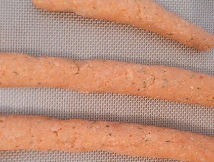 | 3. Maak van het mengsel worsten van ongeveer 1,5cm dik. Als je merkt dat er scheuren ontstaan in het mengsel, knijp je het in de vorm van een worst. Rol het vervolgens alleen nog zacht uit om het wat bij te vormen. Je ziet eventuele bobbels straks toch niet meer in de broodjes. |