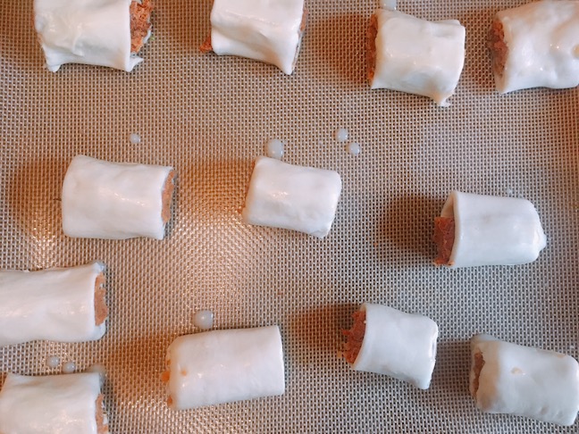 | 7. Leg de worsten op de plakjes bladerdeeg en snijd de worsten op maat. Rol het bladerdeeg met de worst erin op. Snijd de rolletjes in drie stukken en leg ze op de bakplaat. |