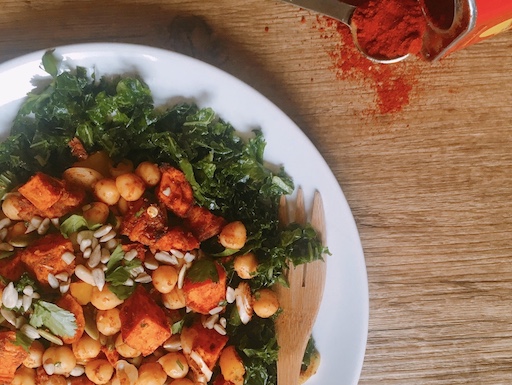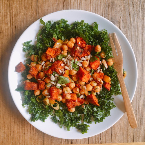 De frisse boerenkool is een mooie basis voor de kruidige zoete aardappel. De zoete aardappel meng je met paprikapoeder, uienpoeder en knoflookpoeder en bak je in de oven. Daarna meng je het met kikkererwten, koriander, komijn en kaneel. Zoete en kruidige, warme smaken meng je dus met de frisse boerenkool.