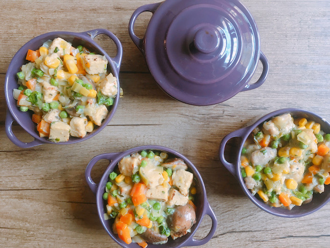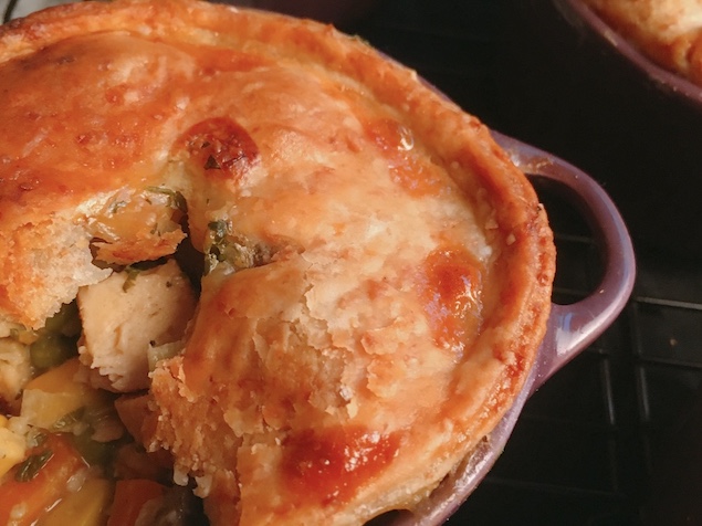 Potje pies, zoals mijn vriend het noemt. Lijkt misschien alsof hij het niet lekker vond, maar hij vroeg toch of we het nog eens konden eten. De romige, sauzige vulling zit vol groenten. Wortel, prei, champignon, doperwten en mais. Het dekseltje heeft wat weg van bladerdeeg. Dit is comfort food, heerlijk in de winter.