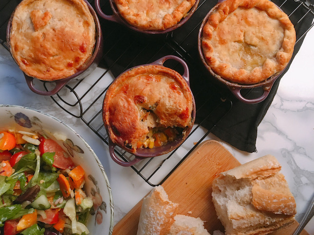 | 9. Meng de melk en ahornsiroop. Bestrijk het deeg hiermee. Bak de pot pies een half uur in de oven. |