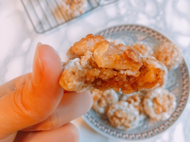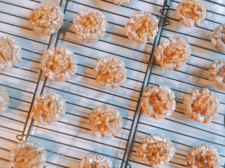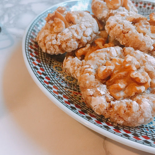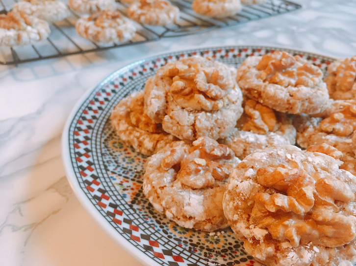 Ghriba zijn Marokkaanse koekjes. Je hebt allerlei soorten. Vaak zie je ze met amandel en soms met kaneel, sesam of kokos. Deze walnoten variant lijkt op gebakken spijs. Krokant van buiten en heerlijk chewy van binnen. Bijna als een macaron, maar dan simpel.