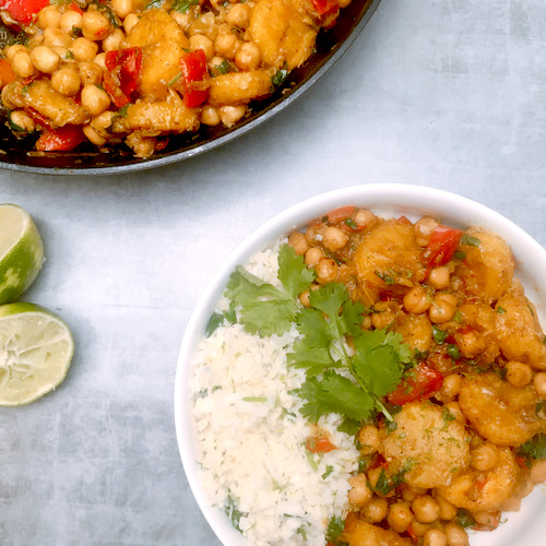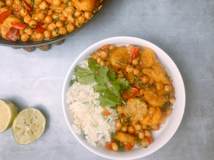 Tropisch sfeertje zo in de winter. Niet door alle vakantie foto’s die ik opeens in november langs zie komen, maar door deze curry. Gewoon gemaakt in mijn kleine Amsterdamse keukentje. Een kruidige, romige curry met bakbaan en kikkererwten. Daarbij bloemkoolrijst met kokos. Ik hoef helemaal niet op vakantie naar een eiland hoor..