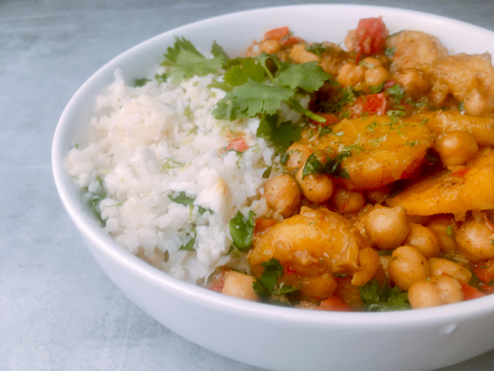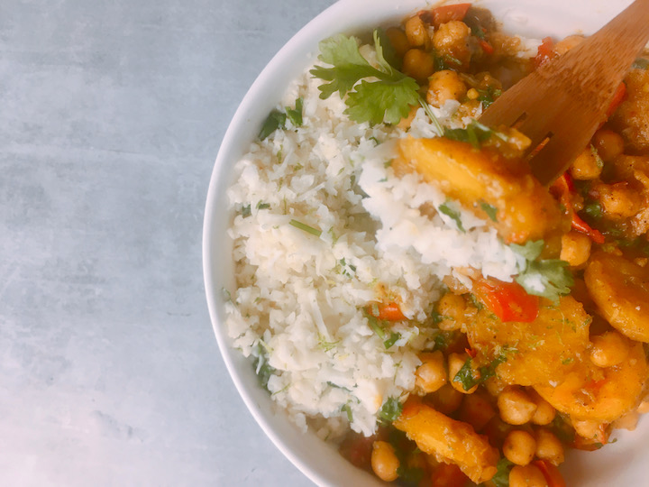 Doordat er bakbanaan en kikkererwten door de curry gaan, is de curry al een gerecht op zich. Toch vind ik rijst er altijd wel erg lekker bij. Om het wat lichter te maken, kies ik dit keer voor bloemkoolrijst. Door wat kokosmelk door de bloemkoolrijst te roeren krijgt deze ook een lekkere tropische smaak. Ik kies trouwens altijd voor light kokosmelk. Kokosmelk bevat veel calorieën, als je voor light kiest is dit soms maar 1/3e van de calorieën.