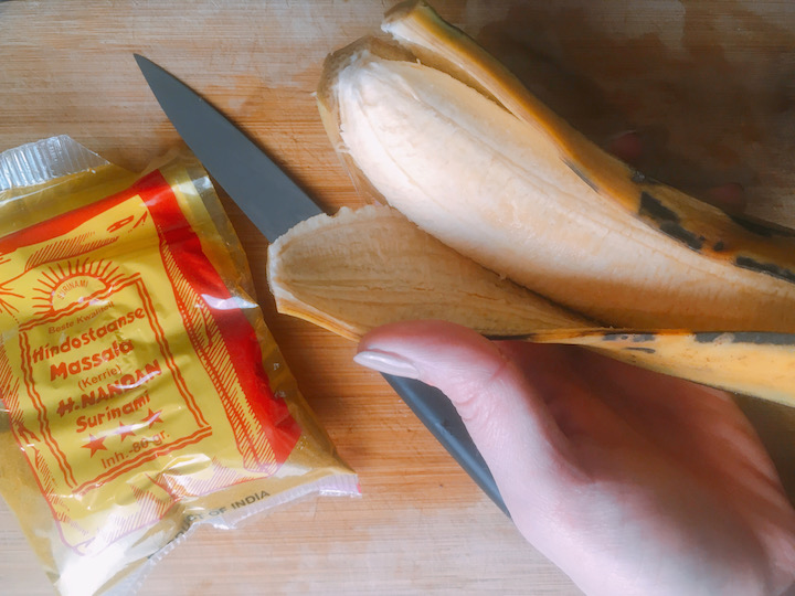 Het belangrijkste onderdeel van dit recept is natuurlijk de bakbanaan. Bakbanaan is steviger dan gewone banaan. Bijna een kruising tussen aardappel en banaan. Door dit recept gaat een gele banaan. Hij is dan wat zoeter dan wanneer hij nog groen is, maar blijft wel stevig tijdens het koken.