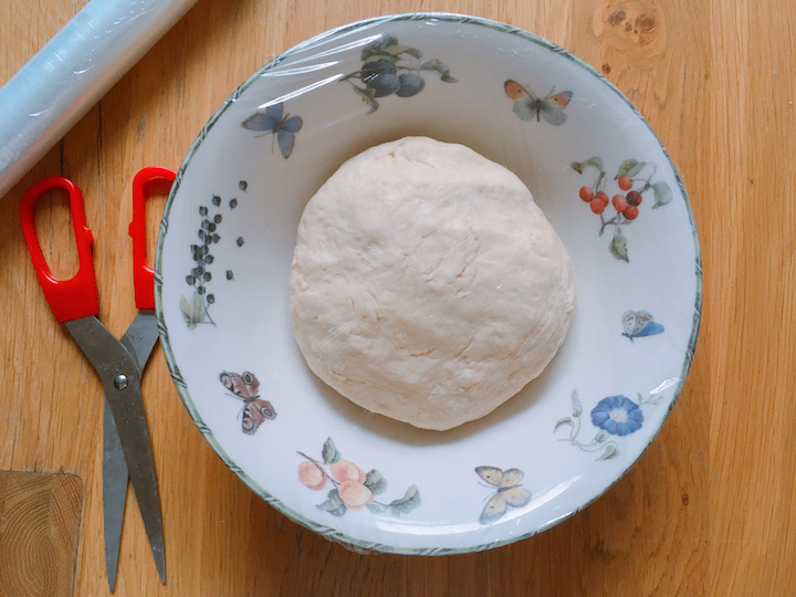 | 7. Als het deeg gerezen is, leg je het op een bebloemd aanrecht. Rol uit tot een dunne rechthoekige lap. |