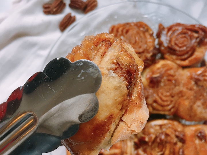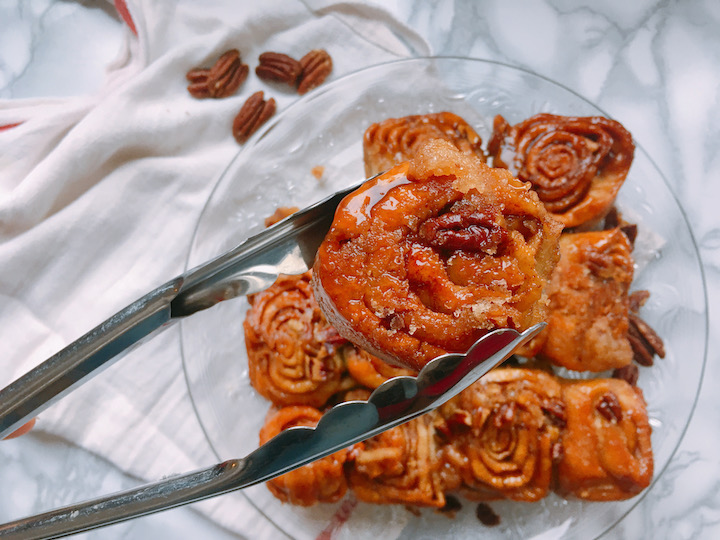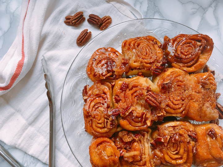 Niks gezonds aan dit recept. Ik zeg het maar gelijk. Dit is cheaten. Wel vegan, maar daar is ook alles mee gezegd. Zoete, kleverige, zachte broodjes. Tussen de laagjes deeg, gaat boter, suiker, kaneel en peccannoten. De broodjes leg je vervolgens op een laag boter en suiker, wat in de oven veranderd in karamel. Zondag bakdag?