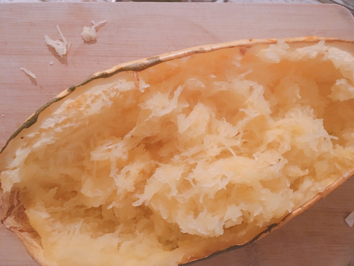 De spaghettipompoen vind ik qua smaak niet heel ander dan andere pompoenen. Wat zo kenmerkend is aan deze pompoen is de draderige textuur, waardoor je hem dus goed als vervanger voor spaghetti kan eten. Het bereiden van de pompoen is simpel, het duurt alleen even. Hij gaat driekwartier tot een uur in de oven. Als hij gaar is, kun je met een vork het vruchtvlees lostrekken. Vervolgens kun je ermee doen wat je wilt. Afhankelijk van de grootte van de pompoen, kun je er met 2-3 personen van eten.