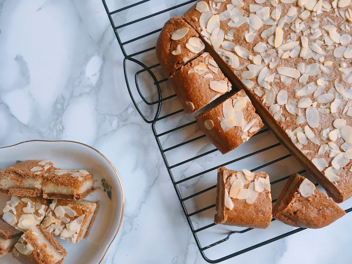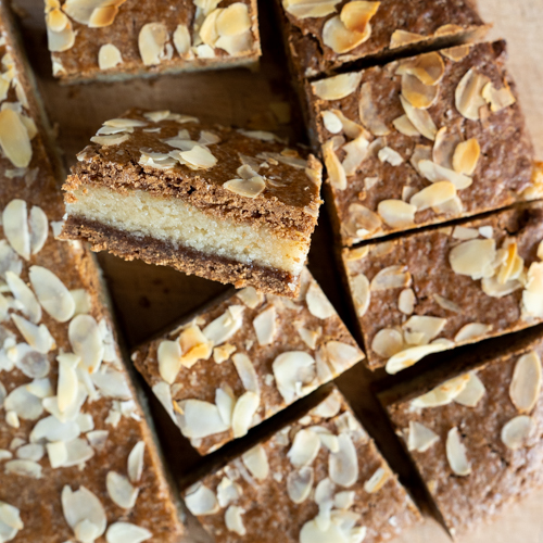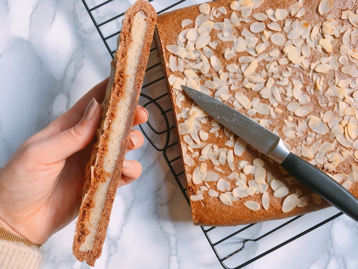 | 10. Verdeel het amandelschaafsel over de gevulde speculaas en druk licht aan. |