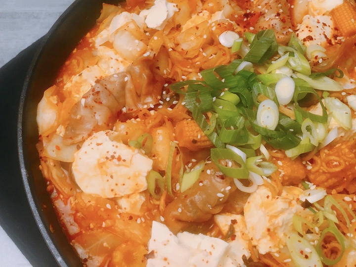 Vaak gaat er aan het einde nog een eitje bij. In plaats daarvan neem ik silken tofu. Dit heeft ook een zachte, romige textuur. Als alles gaar is, kun je de pan zo op tafel zetten of het verdelen over kommen. Strooi er als laatst nog wat bosui over.