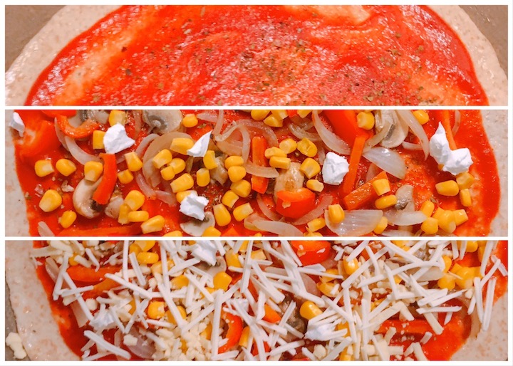 | 9. Verdeel de passata over de bodem. Verdeel hierover de ui, paprika, champignons en mais. Verdeel wat hoopjes roomkaas over de bodem en strooi de kaas erover. |