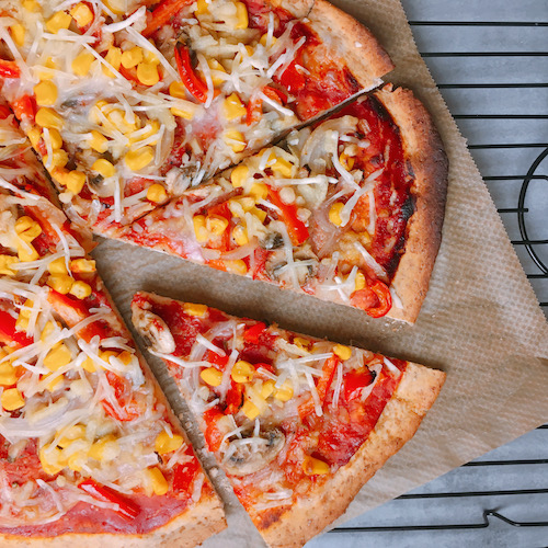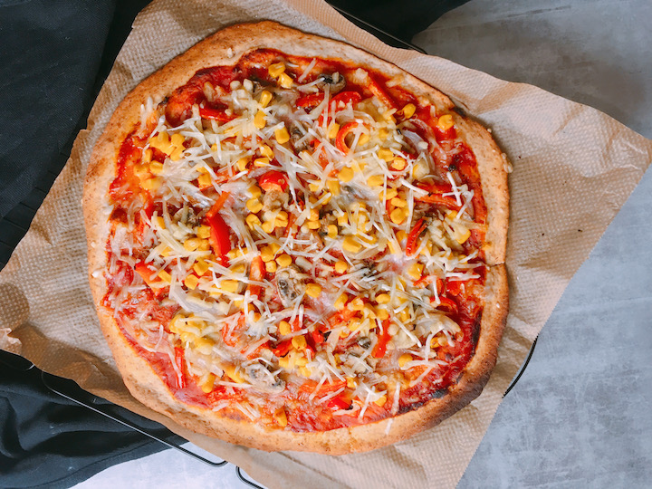 In de zomer maak ik de tomatensaus van verse, rijpe tomaten. Nu in de winter vind ik een passata beter smaken. Je hoeft er alleen nog wat kruiden door te roeren en het is klaar om over je pizza te smeren. Mijn favoriete toppings zijn ui, paprika, champignon en mais. Kies wat je lekker vindt, bak ze kort voor en verdeel ze over je pizza. Maar hou je wel in. Ik heb er ook een handje van om er te veel op te doen, maar je bodem bakt dan niet mooi gaar.