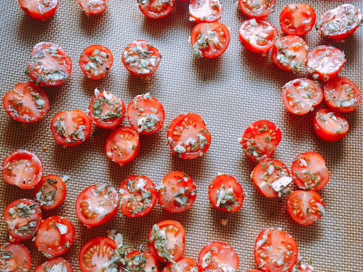 | 3. Leg de tomaatjes met de gesneden kant naar boven op de bakplaat. Leg ook de twee knoflooktenen voor de pastinaakpuree in de schil op de bakplaat. Bak de tomaatjes 2 uur, totdat ze mooi gedroogd zijn. Haal ze uit de oven en zet daarna de oven naar 200°C. |
