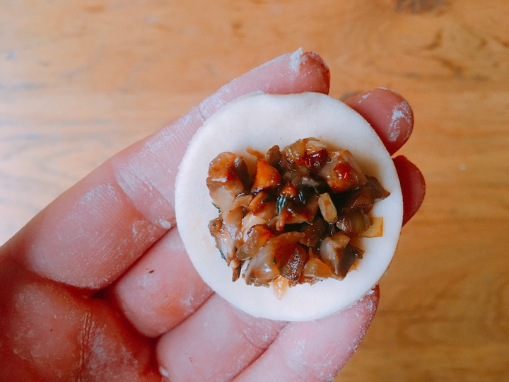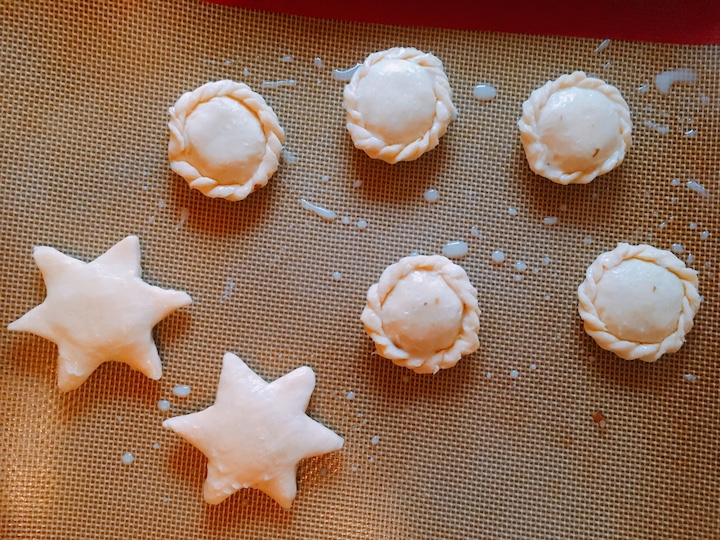 De vouw voor de pasteitjes is hetzelfde als de vouw die ik voor empanadas gebruikte (die zijn niet vegan/vega). Als je dus wilt weten hoe je die maakt, kijk dan even op youtube en zoek op ‘empanada fold’. Maak voor de ronde pasteitjes het randje niet nat. Dit maakt het vouwen erg lastig, het deeg wordt dan namelijk veel te slap. Voor de sterren maak ik de randjes van het deeg wel vochtig. Die vouw je niet, maar druk je alleen. Door het iets vochtig te maken, blijft het wat beter plakken.