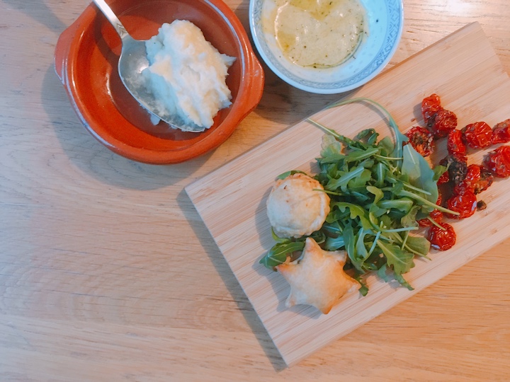 Het zijn veel losse elementen die je moet maken voor dit recept. En dan ben je nog maar bij het voorgerecht. Gelukkig kun je veel van te voren maken. Het deeg en de vulling kun je goed van te voren klaarzetten. Het bakken zou ik wel vlak van te voren doen. Ook de tomaatjes kun je goed van te voren maken en in de koelkast bewaren. Haal ze wel op tijd uit de koelkast, zodat je ze niet helemaal koud serveert. De puree en rucola zou ik op het laatste moment maken.