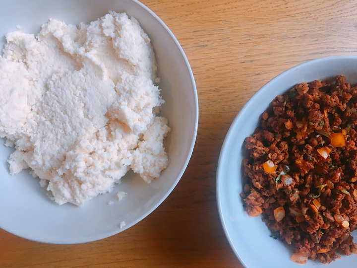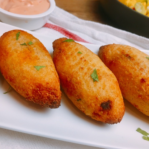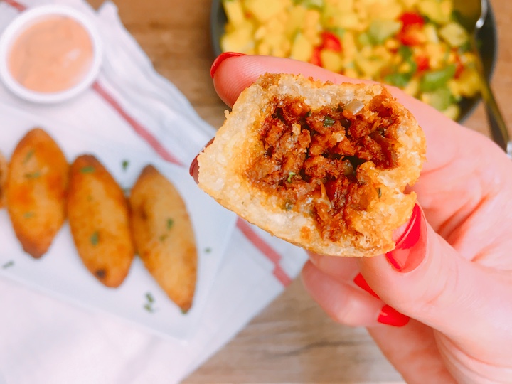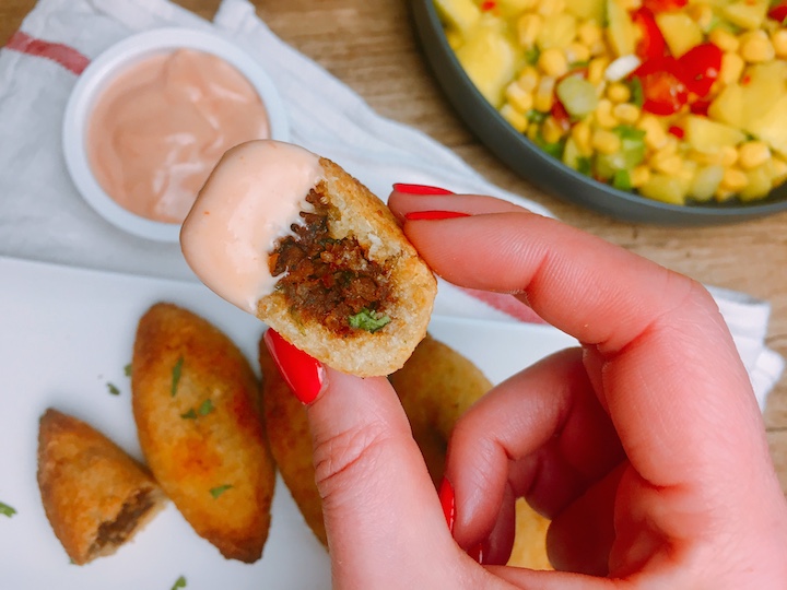 Gelukkig had ik veel te veel cassave gehaald om cassavefriet te maken (dik 2 kilo voor twee personen, oeps). Ik ging opzoek naar wat ik er nog meer mee kon en zo kwam ik op alcapurrias. Geraspte cassave gevuld met vega gehakt en een simpel sausje ernaast. Lekker weekend snackfood, maar uit de airfryer stiekem toch gezond.