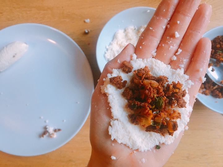 | 8. Neem een lepel cassave en druk plat in je hand. Leg er een hoopje vulling op en druk de vulling wat aan elkaar. Leg er nog een beetje cassave op en vorm tot een rolletje. |