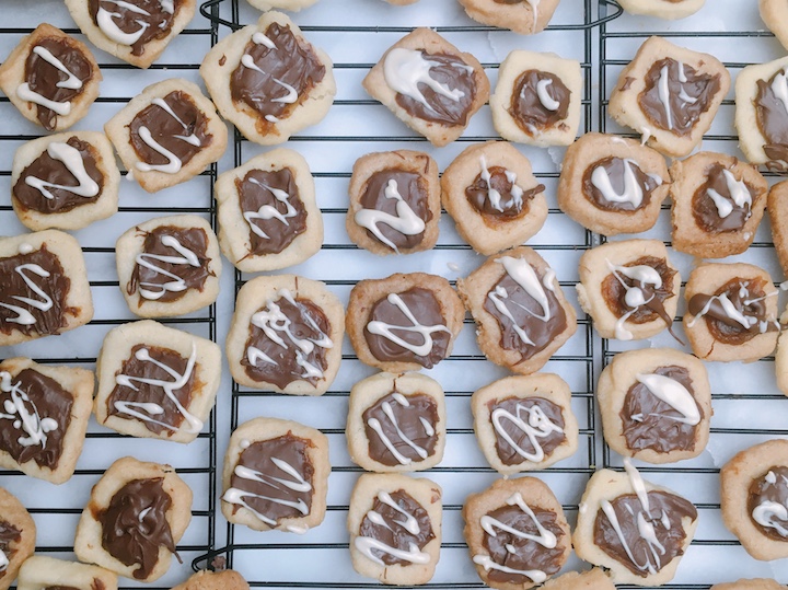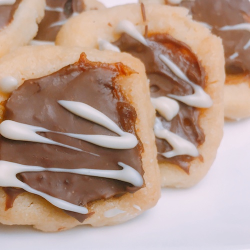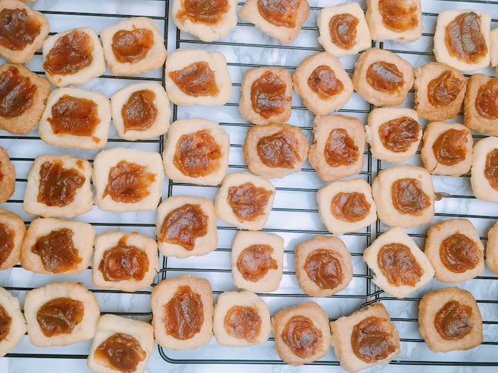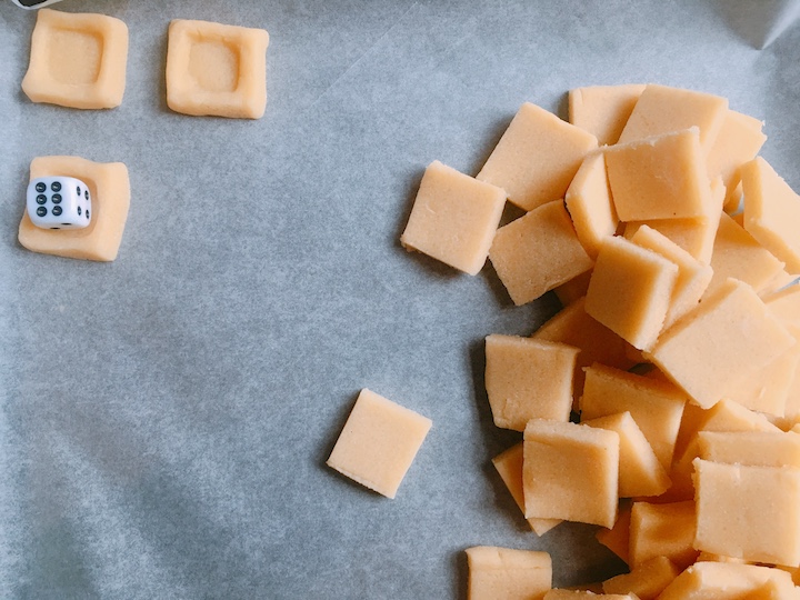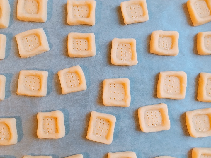Het deeg voor de koekjes rol je uit en snijd je vervolgens in vierkantjes. Je maakt een opstaand randje langs de randen van ieder vierkantje. Om een mooie hoekige vorm te krijgen, kun je een dobbelsteentje gebruiken. Het lagere gedeeltje prik je in met een vork, zodat het niet te erg naar boven komt tijdens het bakken. Als de koekjes warm zijn kun je het kuiltje opnieuw voorzichtig indrukken met het dobbelsteentje.