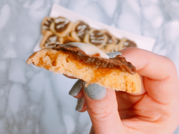 Het is een flink werkje om deze koekjes te maken. Als je tenminste ook allemaal losse koekjes wilt. Je moet het deeg stuk voor stuk vormen, met een opstaand randje. Hierin kun je vervolgens de dadelkaramel en gesmolten chocola doen. Als je net als ik niet heel netjes de chocola uitgesmeerd krijgt, kun je er nog wat witte chocola overheen doen. Maakt het gelijk wat mooier.