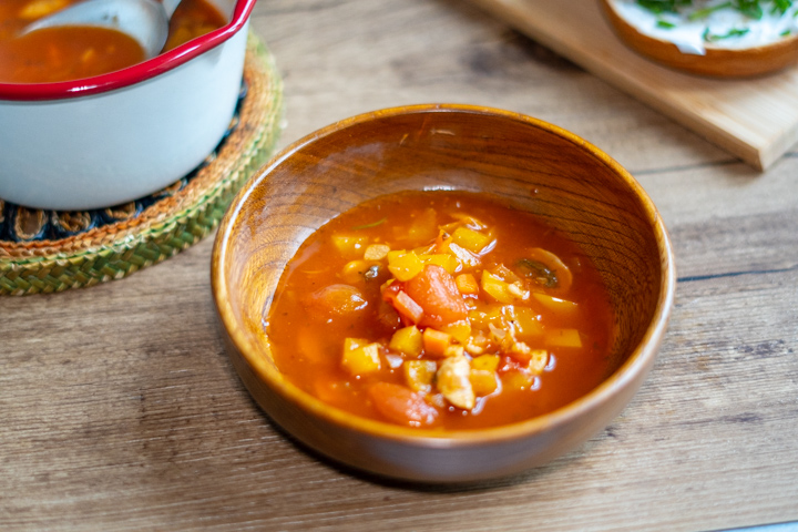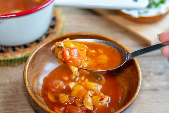 Een uitje en wat knoflook vind ik altijd wel lekker door de soep. In dit geval had ik nog paprika en champignons. Die heb ik ook sowieso bijna altijd wel in huis, wat deze soep extra makkelijk maakt. Als je nog courgette, sperzieboontjes of welke andere groente dan ook in de koelkast heb liggen dan is deze soep ideaal om de restjes op te maken. Je kunt er nog wat vermicelli of bonen door doen, maar zo vind ik hem top met een broodje erbij.