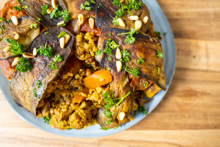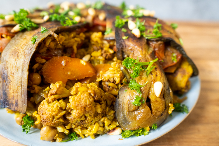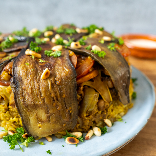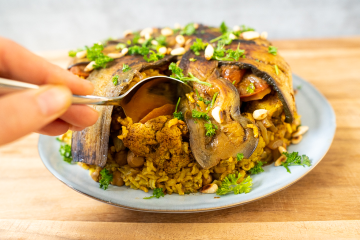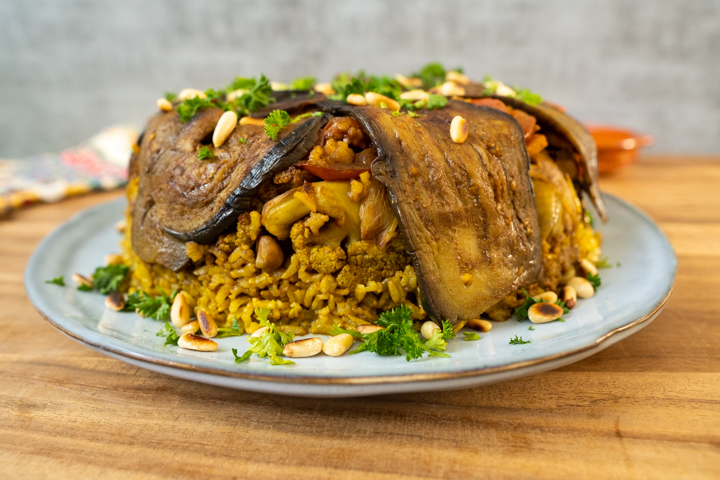 Vandaag een recept uit het Midden Oosten, maqluba. Ik heb mij door mijn vriend laten vertellen dat dit ‘omgekeerd’ betekent, de manier waarop je het gerecht serveert. Een pan vol rijst, groenten en kruiden draai je om op een bord, waardoor je een prachtig gerecht krijgt wat minstens net zo lekker smaakt.