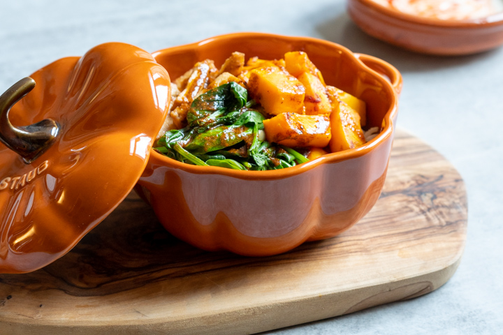 Je zult niet gelijk denken aan Koreaanse bibimbap als je dit gerecht ziet. Toch is het hierdoor geïnspireerd. Rijst met verschillende toppings hussel je op het laatste moment door elkaar met de dressing. Een gloeiend heet schaaltje maakt de rijst krokant. Dit keer alleen met pompoen, spinazie, gerookte tofu en sriracha-yoghurt.