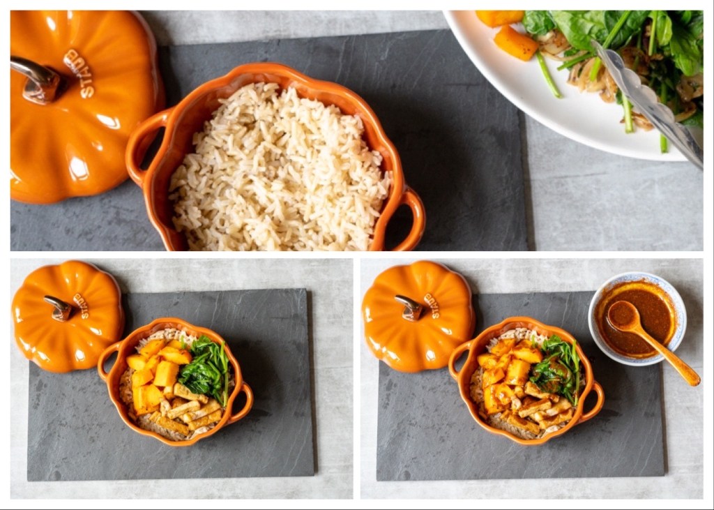 Het hete schaaltje vul je eerst met wat rijst. Hierop verdeel je de toppings: pompoen, spinazie en gerookte tofu. Hier verdeel je de dressing over. Daarna hussel je alles door elkaar. Als je het even laat staan, kan de rijst krokant worden.