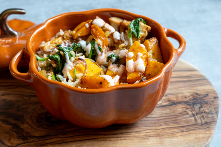 | 10. Haal het schaaltjes uit de oven. Verdeel de rijst over de schaaltjes. Verdeel hier de pompoen, tofu en spinazie over. Giet de dressing erover. |