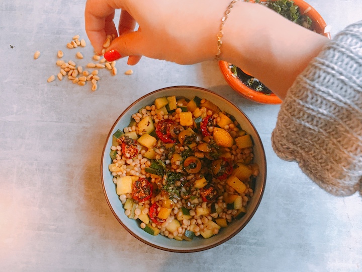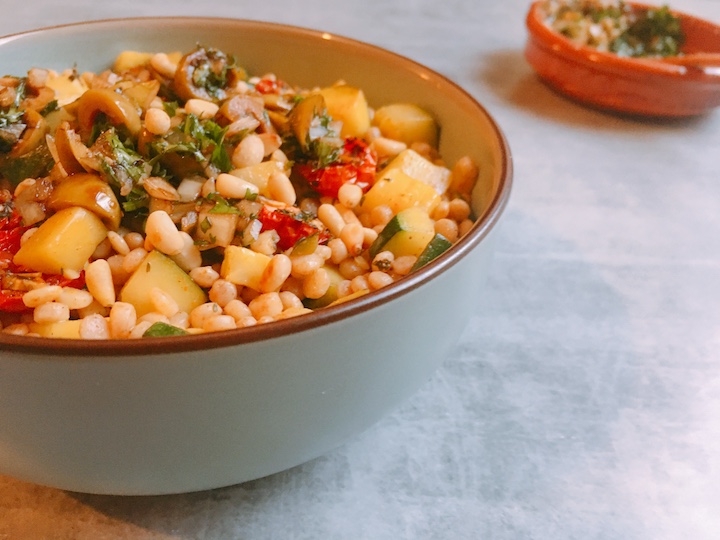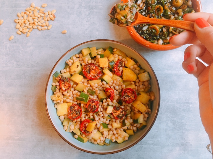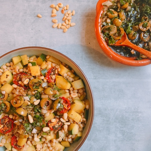 Parel couscous vind ik heerlijk. Kleine, zachte balletjes, bijna als pasta. Met zelfgemaakte gedroogde tomaat, kruidige courgette, olijven en peterselie heb je een gezonde, voedzame salade.