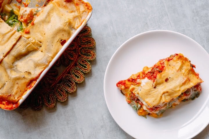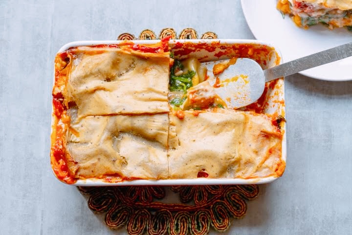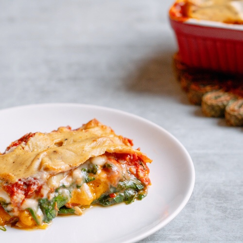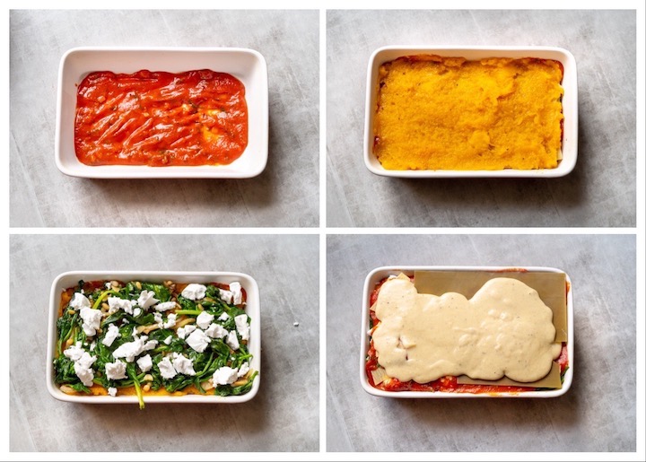 | 10. Vet een ovenschotel licht in. Verdeel de helft van de tomatensaus over de bodem. Leg hier 2 lasagnebladen op. Verdeel de pompoen erover, gevolgd door de spinazie. Leg hier 2 lasagnebladen op. Doe hier de rest van de tomatensaus op. Leg hier 2 lasagnebladen op. Verdeel de bechamelsaus erover. |