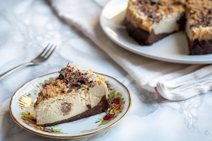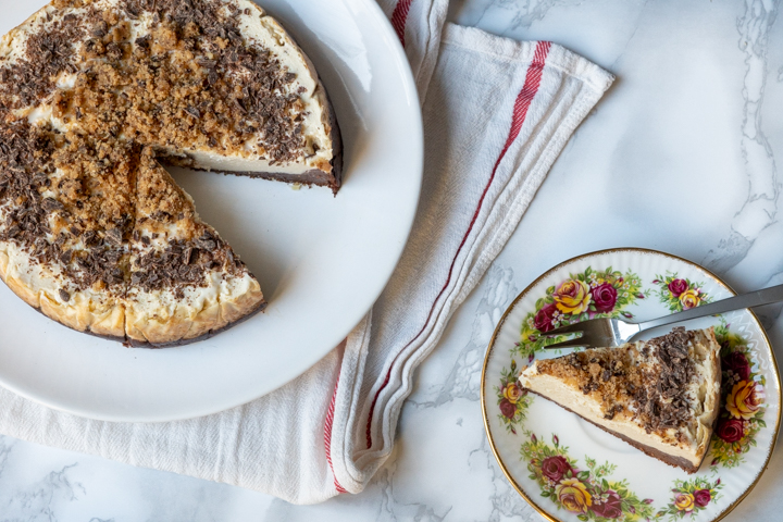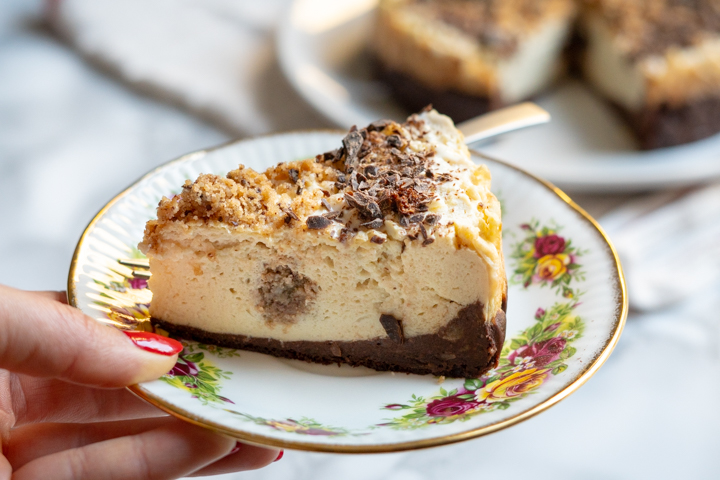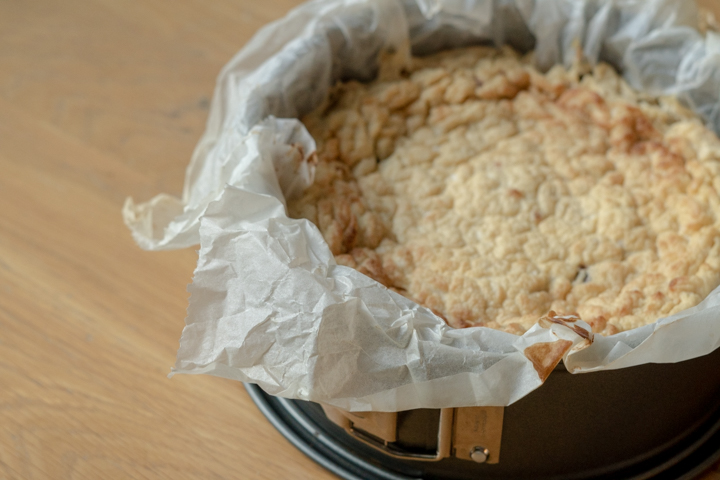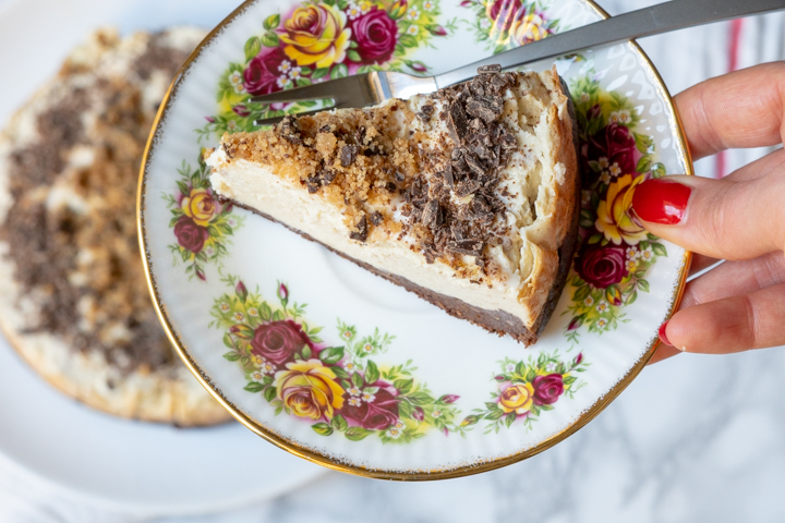 De cheesecake hoort in het midden wat vloeibaar te lijken als hij uit de oven komt. Laat hem minstens 4 uur opstijven in de koelkast, dan wordt hij mooi stevig. Hij kwam bij mij wat bobbelig uit de oven. Daarom heb ik de bovenrand eraf gesneden en de taart gedecoreerd met extra cookie dough en chocola. De knapperige stukjes chocola zijn sowieso heerlijk bij de zachte cheesecake.