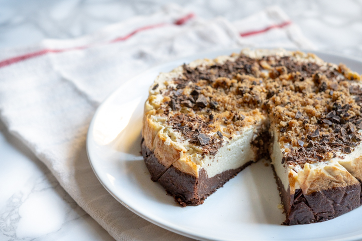 Gebakken cheesecake op een browniebodem, gevuld met cookie dough. Met alle suiker en vet moet dit wel ongezond zijn toch? Dus niet. Deze cheesecake is een stuk lichter, bevat geen suiker én is vegan. Let’s go!