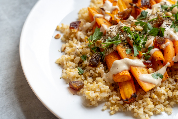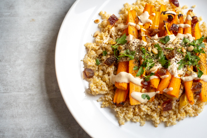 Bulgur zorgt niet alleen voor veel vezels in dit recept, het geeft ook een fijne nootachtige smaak. Het gerecht maak je op in laagjes. Onderop doe je de bulgur, daarop leg je de geroosterde wortel en ui. Daarop gaat tahin, pijnboompitjes, peterselie, dadel en natuurlijk de za’atar.