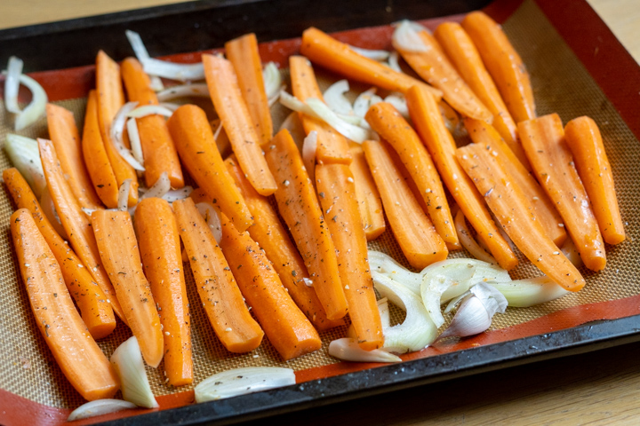 | 2. Schil de wortelen en snijd ze in de lengte door de helft. Snijd de ui in halve ringen. Leg op de bakplaat. |