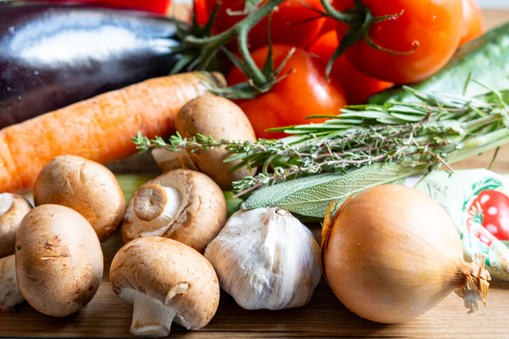 Wortel, ui en bleekselderij snijd ik in kleine blokjes. De courgette, aubergine en champignons snijd ik wat groter. Ik vind het lekker als je wat stukjes groenten in de saus hebt. De tomaten snijd ik in blokjes, hierdoor heb je geen last van de schilletjes. Je kunt ze ook ontvellen of zoals mijn moeder malen in een keukenmachine.